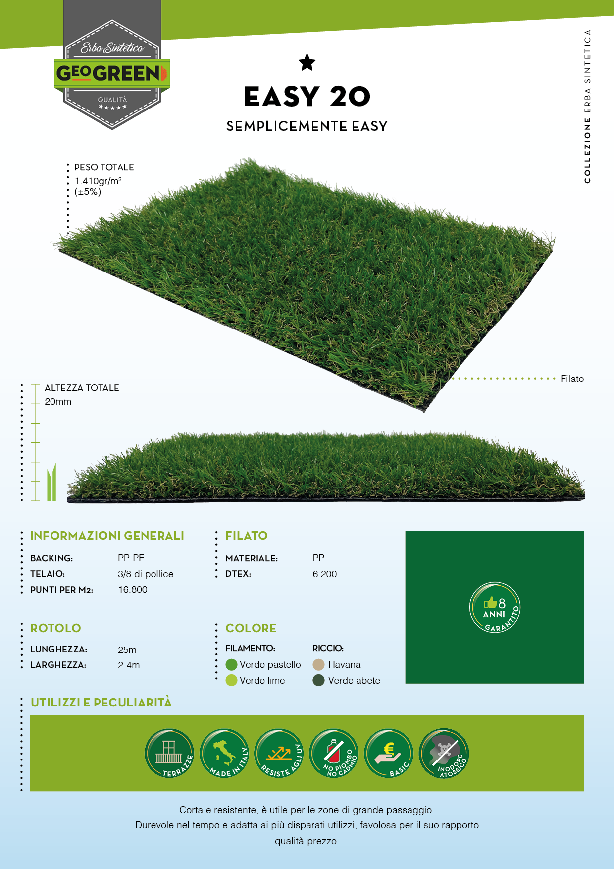 Con la nostra erba sintetica di alta qualità, vi offriamo l'opportunità di rivoluzionare il vostro giardino, terrazza o qualsiasi altro ambiente esterno desideriate rendere più vivace e accogliente. Prodotto con la massima cura e attenzione in Italia, la nostra erba sintetica offre una serie di vantaggi unici che la rendono la scelta ideale per qualsiasi progetto di paesaggistica.